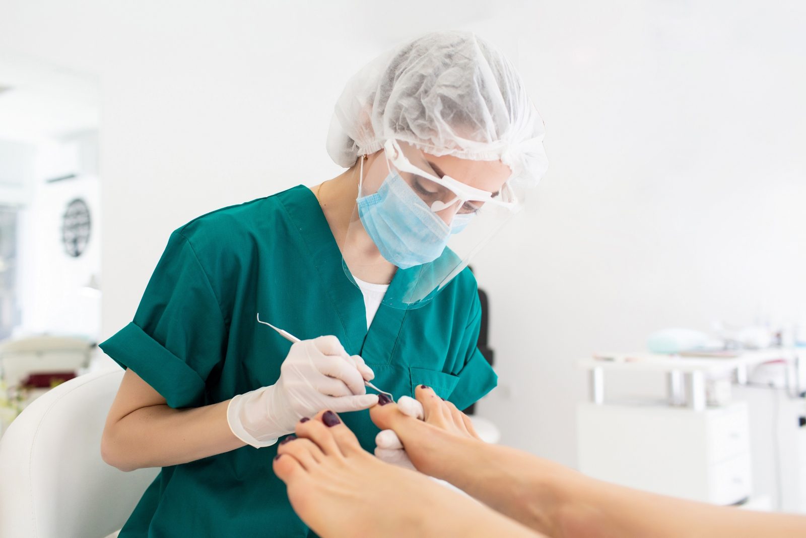 Master during a pedicure. The process of professional pedicures. The masked wizard prepares a special tool for nails to apply gel polish. The master in a protective mask is busy with the pedicure process on female feet. The concept of beauty and health.